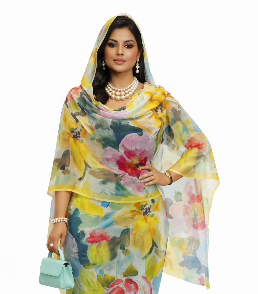 Yellow Floral Full Width Voile. Width1.40 Cm, Weight 0.450 Grams, Hand Wash.